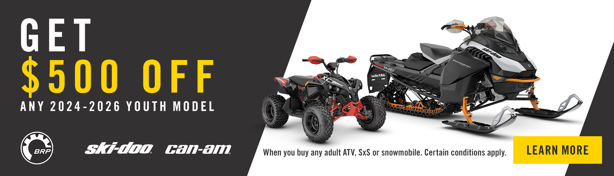 Offers valid in U.S.A. only from November 1, 2025 to March 31, 2026. The conditions may vary depending on your location and this offer is subject to termination or change at any time without notice. This offer is not refundable, exchangeable or transferable (including from one dealership to another), cannot be redeemed for cash, credit or other products of equivalent value and cannot be combined with any other offer or rebate. Null where prohibited by law. Until supplies last. Returns of any portion of the purchase will require equal forfeiture of offer or amount equal to the offer. Eligible models are new and unused 2024-2026 Can-Am ATV or Ski-Doo Youth models.